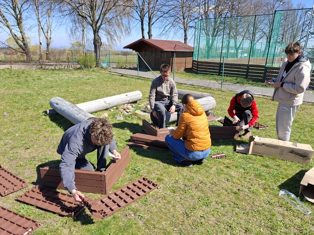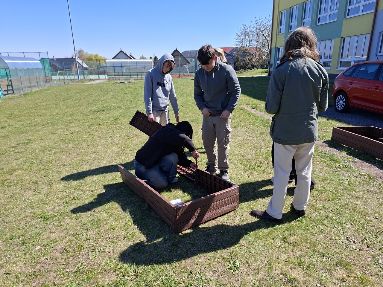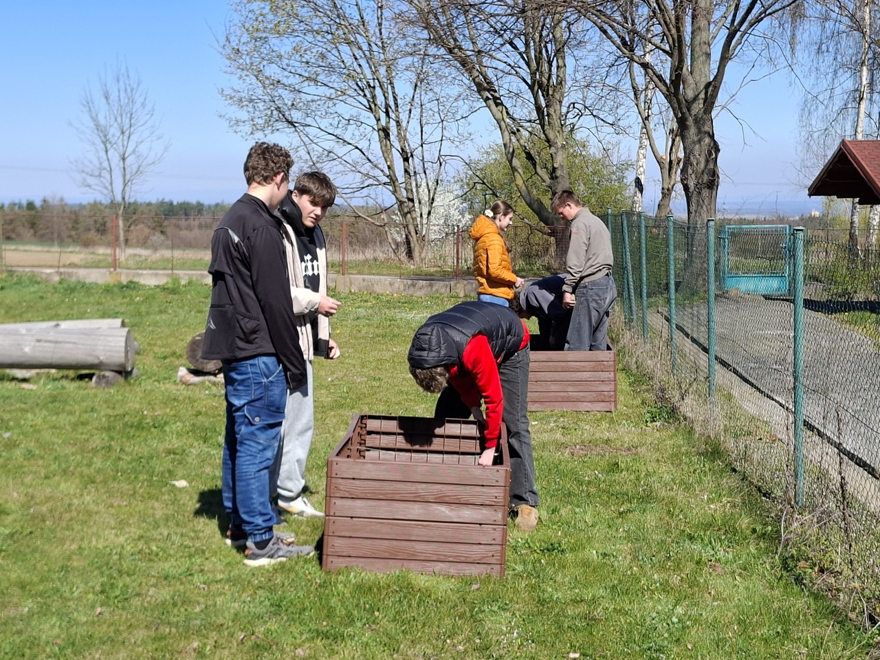 Budování školní zahrady se dostalo do další fáze. Ve čtvrtek 9. dubna 2026 složili žáci devátých tříd obvodovou konstrukci vyvýšených záhonů.