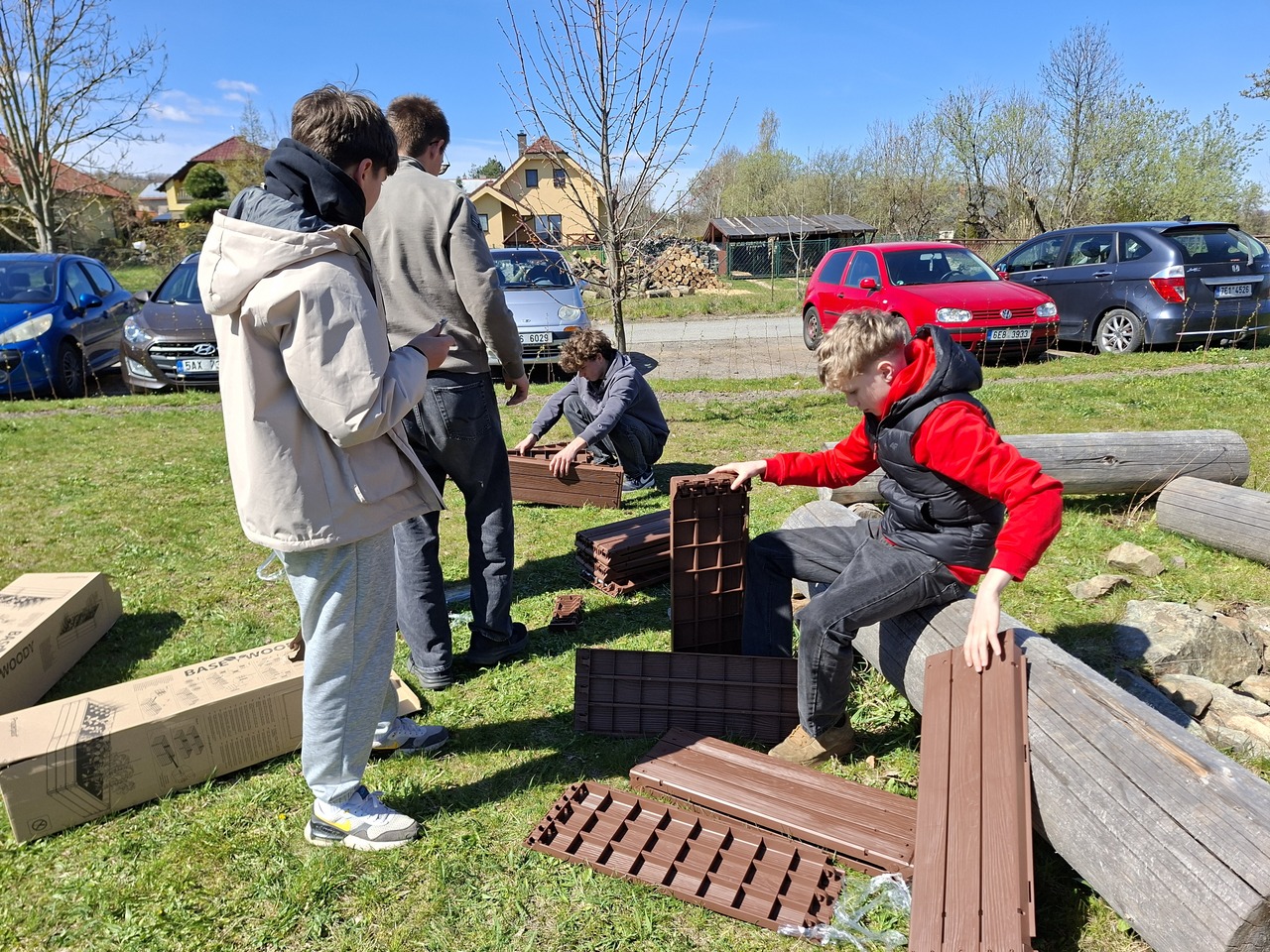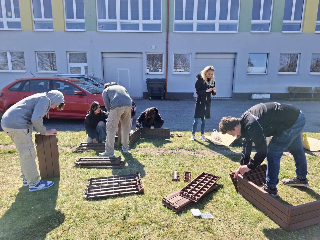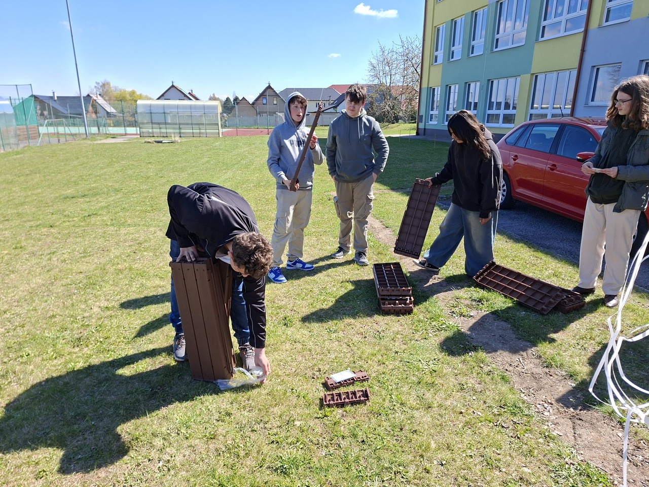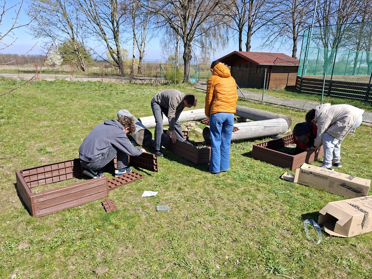 Budování školní zahrady se dostalo do další fáze. Ve čtvrtek 9. dubna 2026 složili žáci devátých tříd obvodovou konstrukci vyvýšených záhonů.